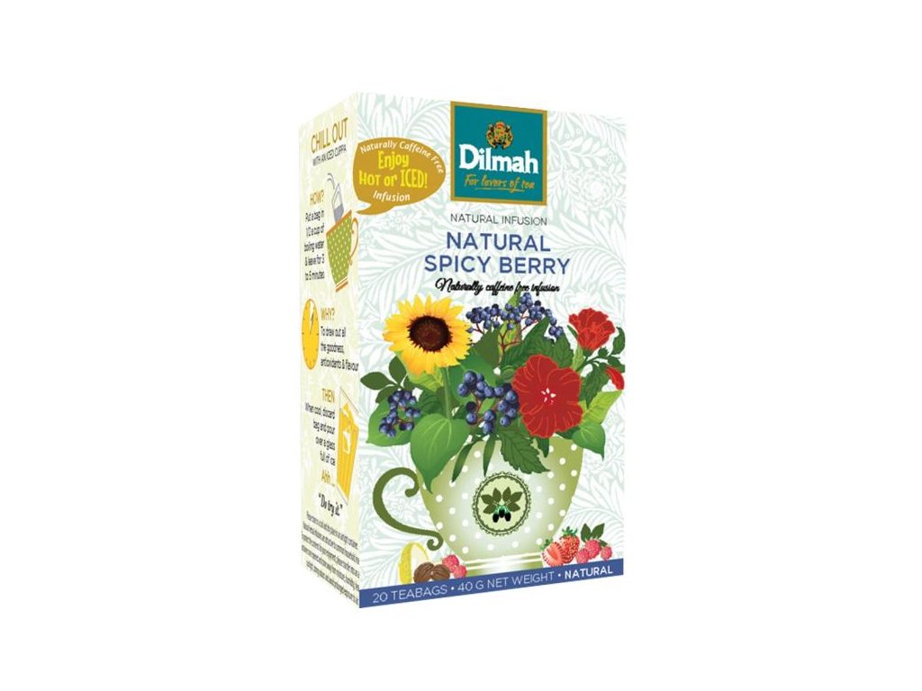 Ovocná prírodná čajová zmes bobuľovitého ovocia, byliniek a korenín.Unikátna prírodná zmes bobuľovitého ovocia, byliniek a korenín. Čaj Dilmah Naturally Spicy Berry má nezameniteľnú ovocnú chuť a arómu. Neodporúča sa pridávať mlieko. Med je vhodný ako sladidlo.