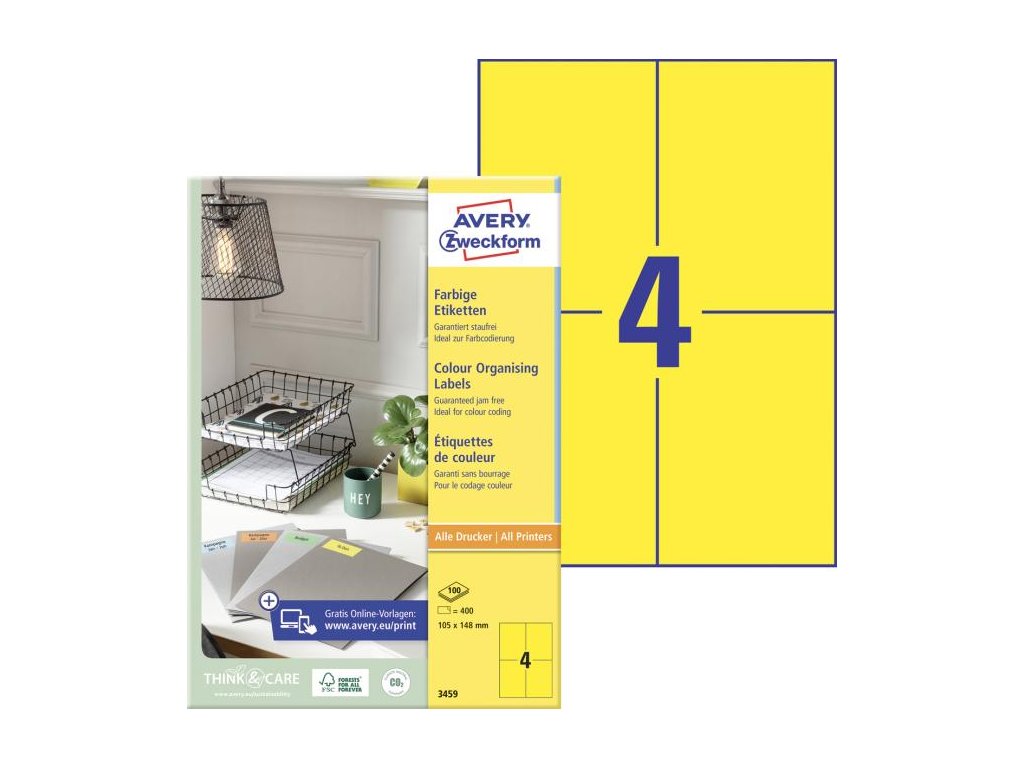 Etikety farebné 105x148mm Avery A4 100 hárkov žlté