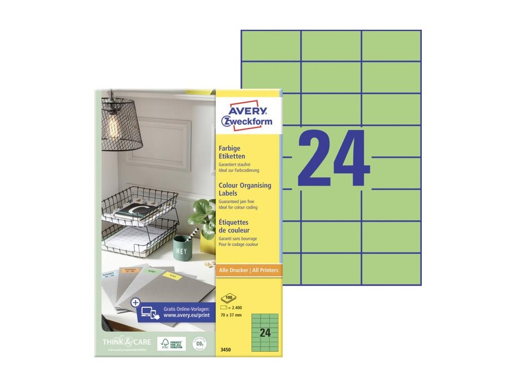 Etikety farebné 70x37mm Avery A4 100 hárkov zelené