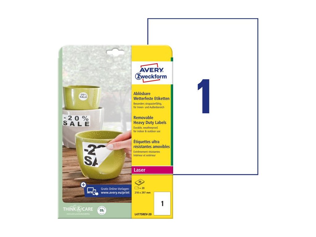 Etikety polyesterové veľmi odolné 210x297mm Avery A4 biele odnímateľné 20 hárkov