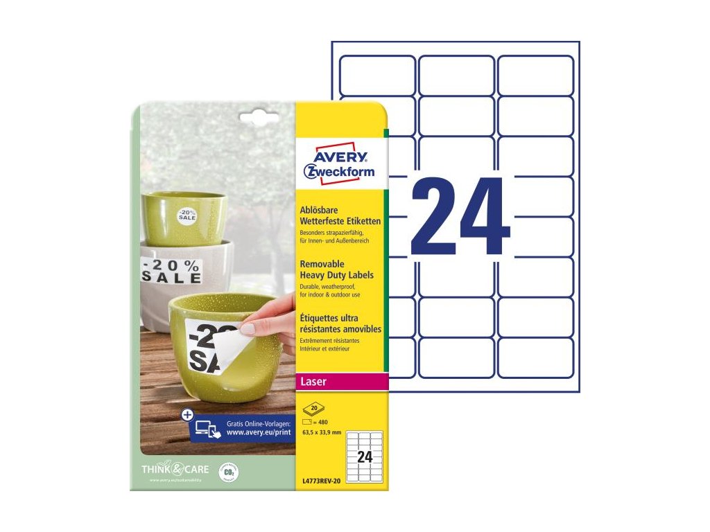 Veľmi odolné polyesterové etikety s nepermanentným lepidlom umožňujú odlepenie etikety bez zanechania stôp po lepidle. Sú odolné voči natrhnutiu, mastnote, nečistotám, UV žiareniu a teplotám od −20 ° do +80 °C a vhodné pre tlač v laserových tlačiarňach a kopírkach. Rozmery v mm : 63,5 × 33,9. Farba biela. Etikety na hárku 24 kusov. Balenie 20 hárkov.Dodatočné parametre