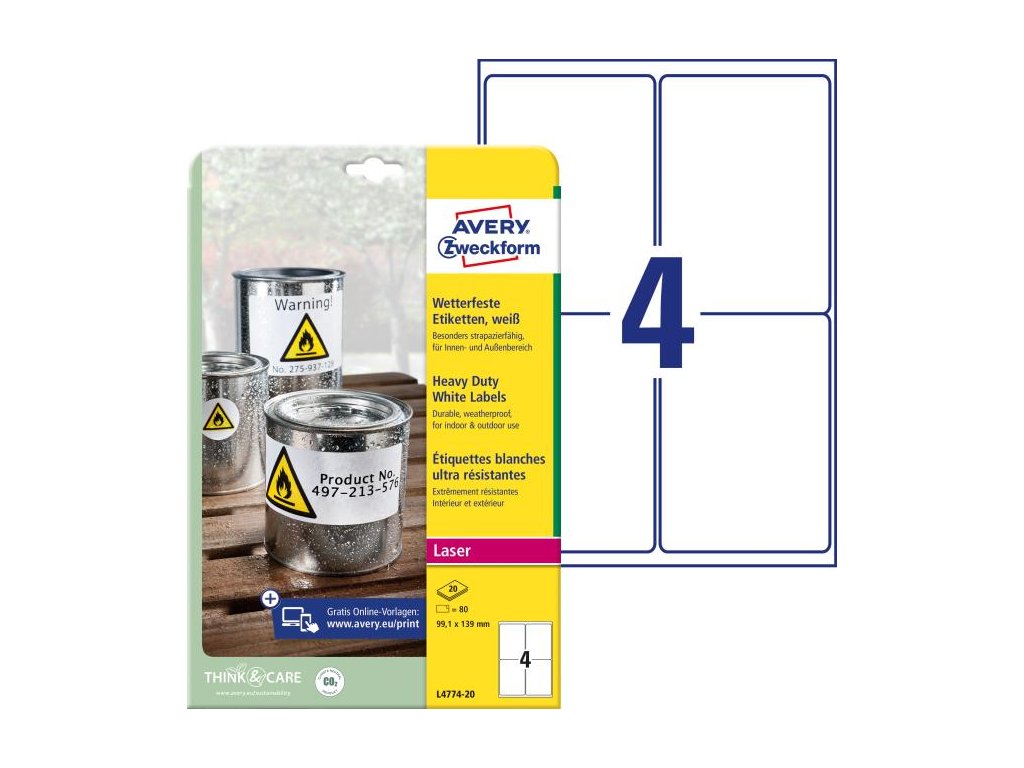 Veľmi odolné polyesterové etikety odolné voči oleju, prachu, špine, natrhnutiu, vode. Odolné voči teplotám od -20° do +80°C. Sú určené pre tlač v laserových, farebných laserových tlačiarňach a kopírkach a sú vhodné aj pre vonkajšie použitie.Rozmery v mm : 99,1 × 139. Farba biela. Etikety na hárku 4 kusov. Balenie 20 hárkov.