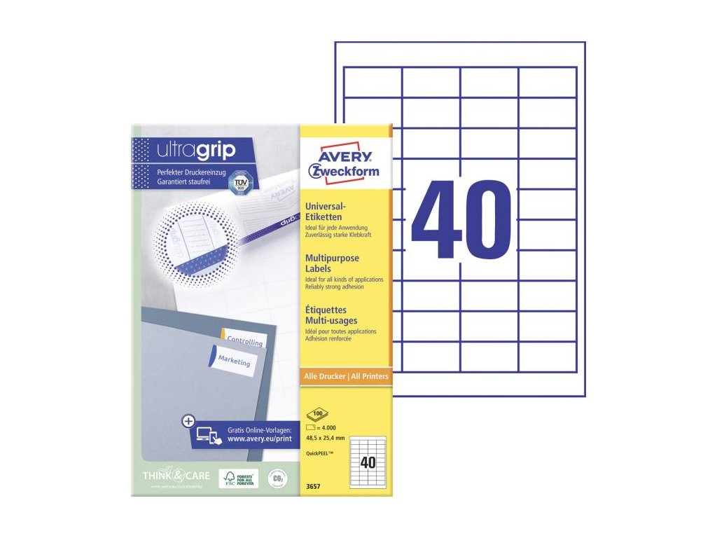 Biele univerzálne etikety vhodné na každodenné použitie v atramentových a laserových tlačiarňach a kopírovacích strojoch. Vďaka inovatívnej technológie ultragrip sa môžete spoľahnúť na bezchybné natiahnutie archu a tlač bez zasekávania. Bezpečnostný okraj QCT zabraňuje zanášaniu tlačiarne lepidlom. Pre laserové tlačiarne testované a certifi kované TÜV SÜD. Vysoká lepivosť na rôznych povrchoch. Ostrá tlač bez bez rozmazávania. Etikety sú vyrobené spôsobom šetrným k životnému prostrediu, majú certifi káciu FSC®, sú bielené bez použitia chlóru. Šablóny a softvér pre jednoduchú a rýchlu tlač etikiet k dispozícii zdarma. U niektorých rozmerov systém QuickPEEL™ na rýchlejšie odlepenie etikiet. Formát A4. Balenie 100 hárkov. Farba biela.Dodatočné parametre
