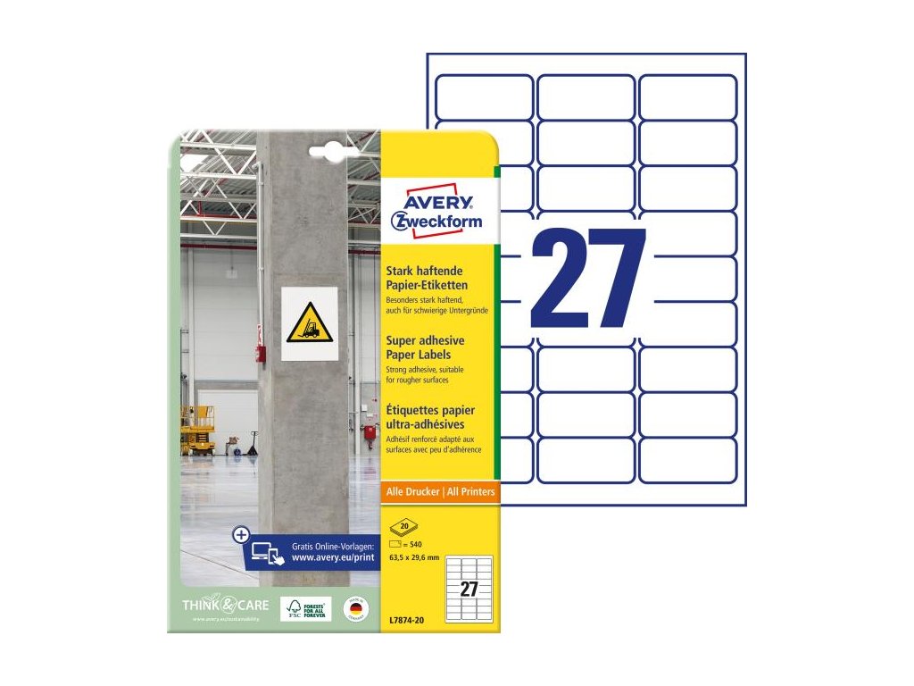 Etikety univerzálne 63,5x29,6mm Avery A4, silne lepivé 20 hárkov