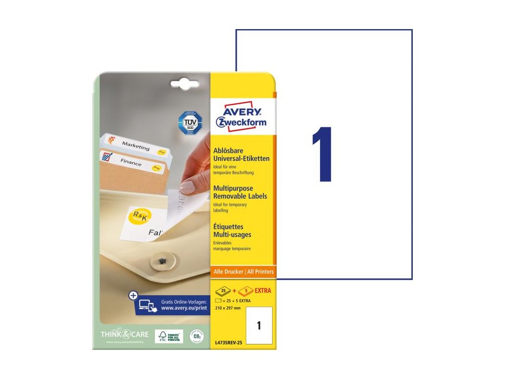 Etikety univerzálne odnímateľné 210x297mm Avery A4 25+5 hárkov