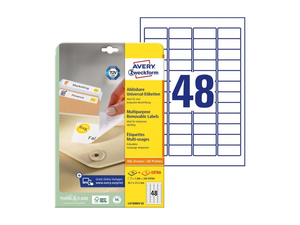 Odnímateľné samolepiace etikety odlepiteľné a znovu prelepiteľné (na bežnom povrchu až 5×) bez toho, aby zanechali stopy lepidla. Sú vhodné pre všetky druhy tlačiarní a kopíriek. Využiteľné najmä na každodenné pracovné činnosti, ako napr. vytváranie popisov, cenoviek, označovanie výrobkov, majetku a pod. Rozmery v mm : 45,7 × 21,2. Farba biela. Etikety na hárku 48 ks. Balenie 25+5 hárkov.Dodatočné parametre