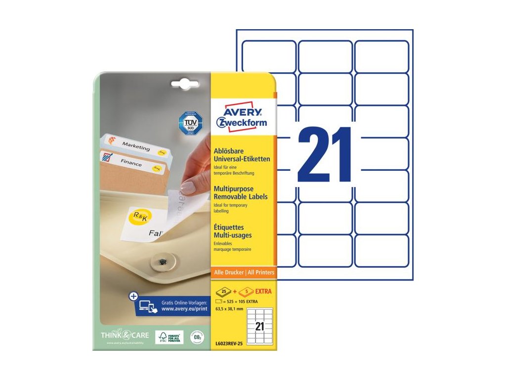 Odnímateľné samolepiace etikety odlepiteľné a znovu prelepiteľné (na bežnom povrchu až 5×) bez toho, aby zanechali stopy lepidla. Sú vhodné pre všetky druhy tlačiarní a kopíriek. Využiteľné najmä na každodenné pracovné činnosti, ako napr. vytváranie popisov, cenoviek, označovanie výrobkov, majetku a pod. Rozmery v mm : 63,5 × 38,1. Farba biela. Etikety na hárku 21 ks. Balenie 25+5 hárkov.Dodatočné parametre