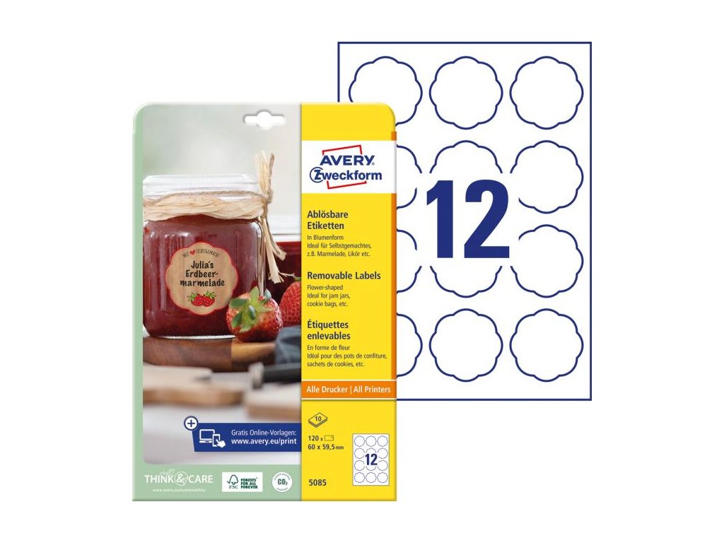 Etikety v tvare kvetu 60x59,5mm Avery 10 hárkov biele