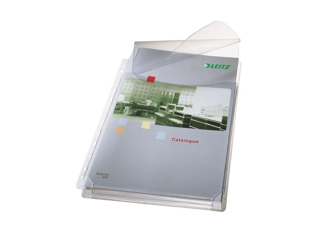 Priehľadný obal z polypropylénu. Vďaka veľkej kapacite je obzvlášť vhodný na zakladanie katalógov, cenníkov a objemnejších dokumentov. Eurodierovanie, povrch mierne pórovitý, spodný a bočný klin v šírke 23 mm, horná chlopňa. Otvorené spodné rohy obalu zaistia, že sa rohy vložených dokumentov neohnú a nezničia. Otvor zhora, formát A4, hrúbka 170 µm. Balenie 5 ks v sáčku.Materiál: polypropylén
