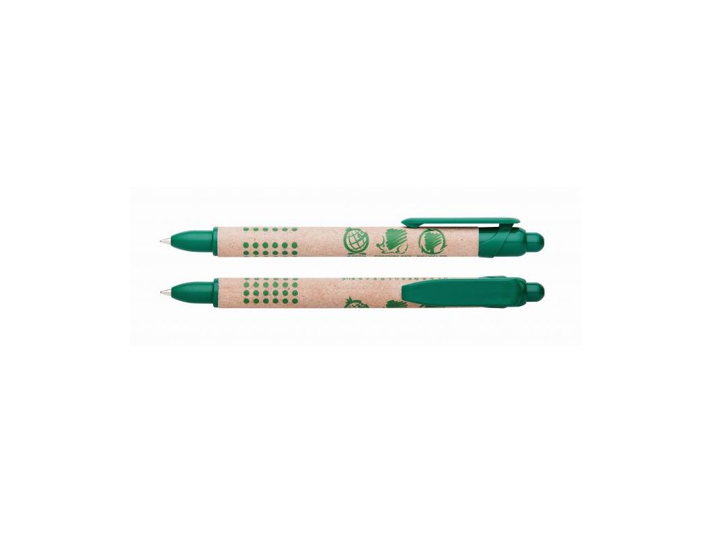 Klikacie guľôčkové pero vyrobené zo 100 % recyklovaného papiera a 30 % recyklovaného plastu. Zostavené s náplňou X-20. Dĺžka písania 2500 m. Papierové časti sú recyklovateľné. Náplň nie je vymeniteľná, ale je odnímateľná pre selektívnu likvidáciu odpadu. Guľôčka 0,8 mm. Farba tuhy: modrá.Dodatočné parametre