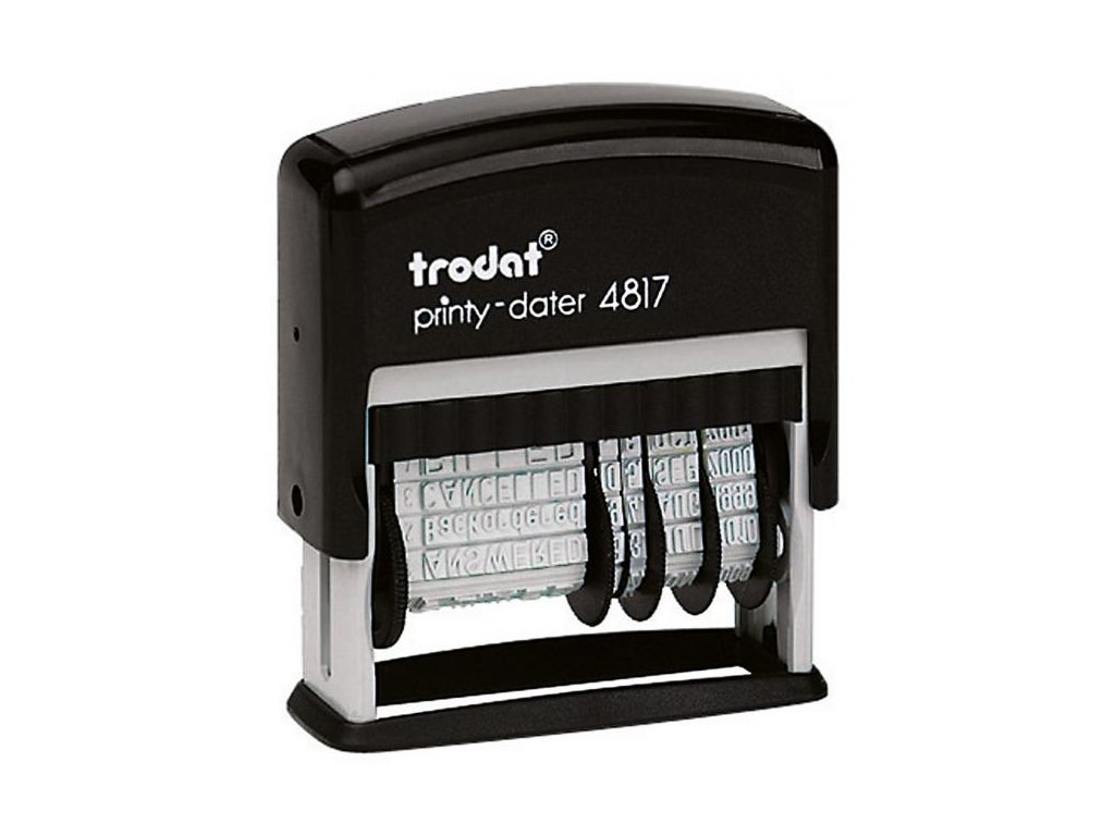 Samofarbiaca dátumová a textová pečiatka súčasne. Výška písma 3,8 mm. Možnosť výberu z textov: DOŠLO DŇA, ZAÚČTOVANÉ, VYBRANÉ DŇA, VLOŽENÉ DŇA, FAKTUROVANÉ, @ - MAIL DŇA, INVENTÚRA, OBJEDNANÉ, ODOSLANÉ, UPOMIENKA, VYBAVENÉ DŇA,ZAPLATENÉ. Náhradné podušky typ 6/4817.Náhradné podušky: trodat 6/4817