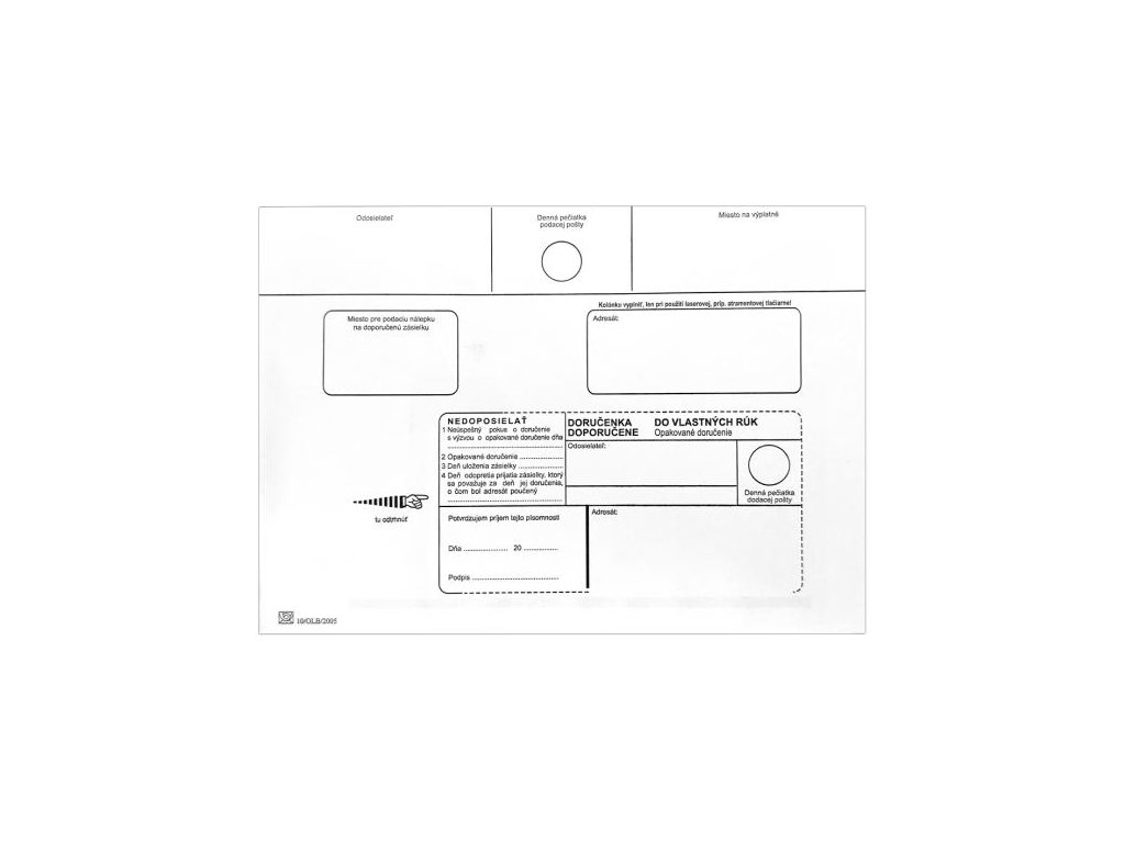 Doručenkové obálky formátu C5 (162x229 mm) do vlastných rúk sú priamoprepisujúce a sú vhodné pre automatické spracovanie na poštových triediachich strojoch. Vyrobené sú z papiera gramáže 90 g.. Obálky majú možnosť opakovaného doručenia NEDOPOSIELAŤ a obsahujú silikónovú pásku.bal=1000ksDodatočné parametre