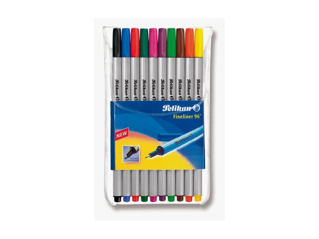 Jednorazový liner Pelikan Fineliner 96 - 10ks, priemer hrotu 0,4 mm. Vhodný pre presné písanie, kreslenie, rysovanie podľa šablóny alebo pravítka. Balenie v plastovom obale, 10 farieb.Dodatočné parametre