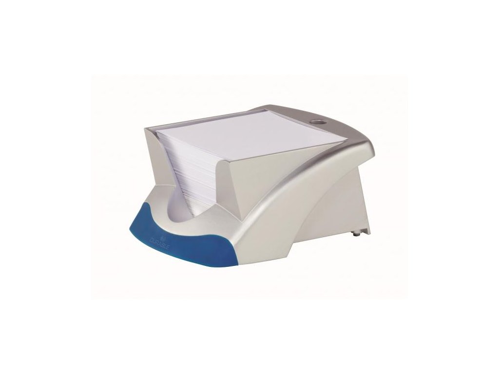 Štýlový stojan na bloky v dizajne produktovej rady DURABLE VEGAS dodávaný s 500 papierikmi bielej farby rozmerov 90×90 mm. Ľahký prístup k papierikom, priestor na pero, protišmyková úprava. Rozmery (š×v×d) 116×70×153 mm.Farba: strieborná/modrá