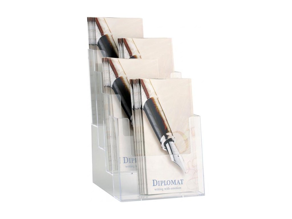 Stojan na prospekty formátu A5 so štyrmi oddielmi. Materiál priehľadný číry plast. Rozmery (š x v x h) 165 x 260 x 155 mm.Dodatočné parametre