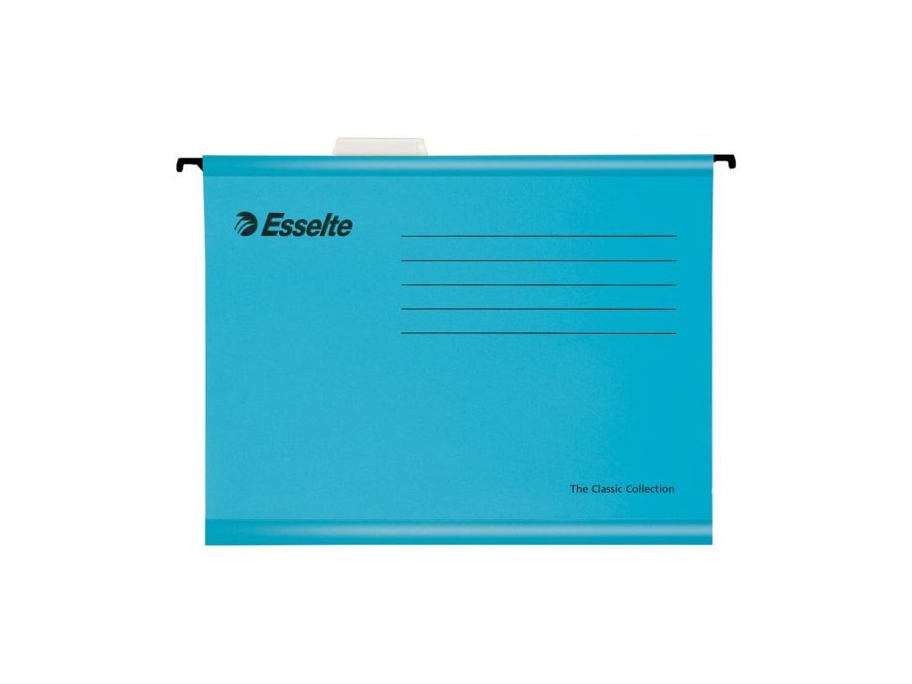 Závesné obaly Esselte kolekcie Classic vyrobené z pevného kartónu. Lisované dno obalu dovoľuje zvýšiť kapacitu na 30 mm. Súčasťou obalu je násuvný index z priehľadného plastu s výmenným papierovým štítkom. Formát A4, rozpätie vodiacich líšt 330 mm.Farba: jasná modrá